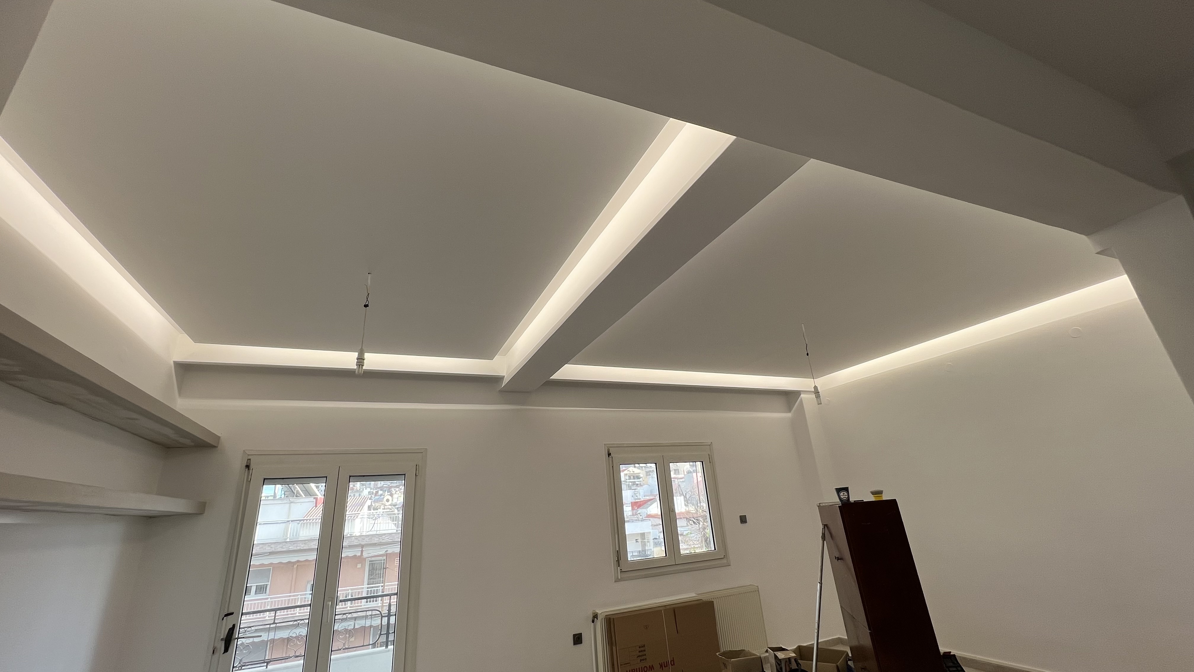 Τοποθετούμε ψευδοροφές σε κάθε τύπο χώρου, δημιουργώντας επίπεδα, κρυφούς φωτισμούς και μοντέρνες γραμμές. |